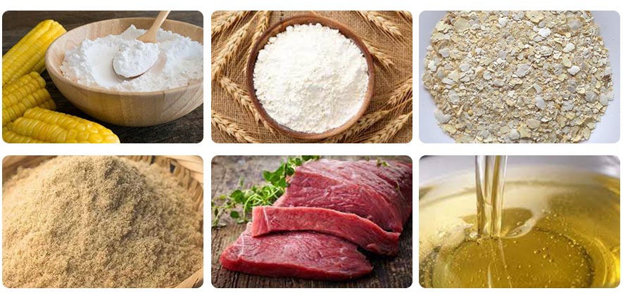 Harina de arroz, harina de maíz, harina de trigo, harina de copos de soja a baja temperatura, salvado de arroz, salvado de trigo, pescado en polvo, huesos en polvo, etc.